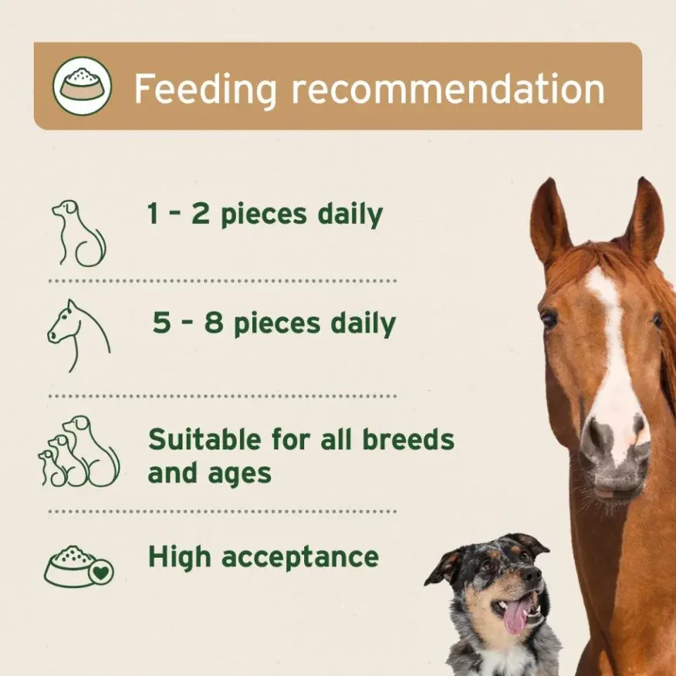 - Pour les chevaux : Idéal comme récompense après le travail ou pour faciliter la prise de compléments alimentaires.