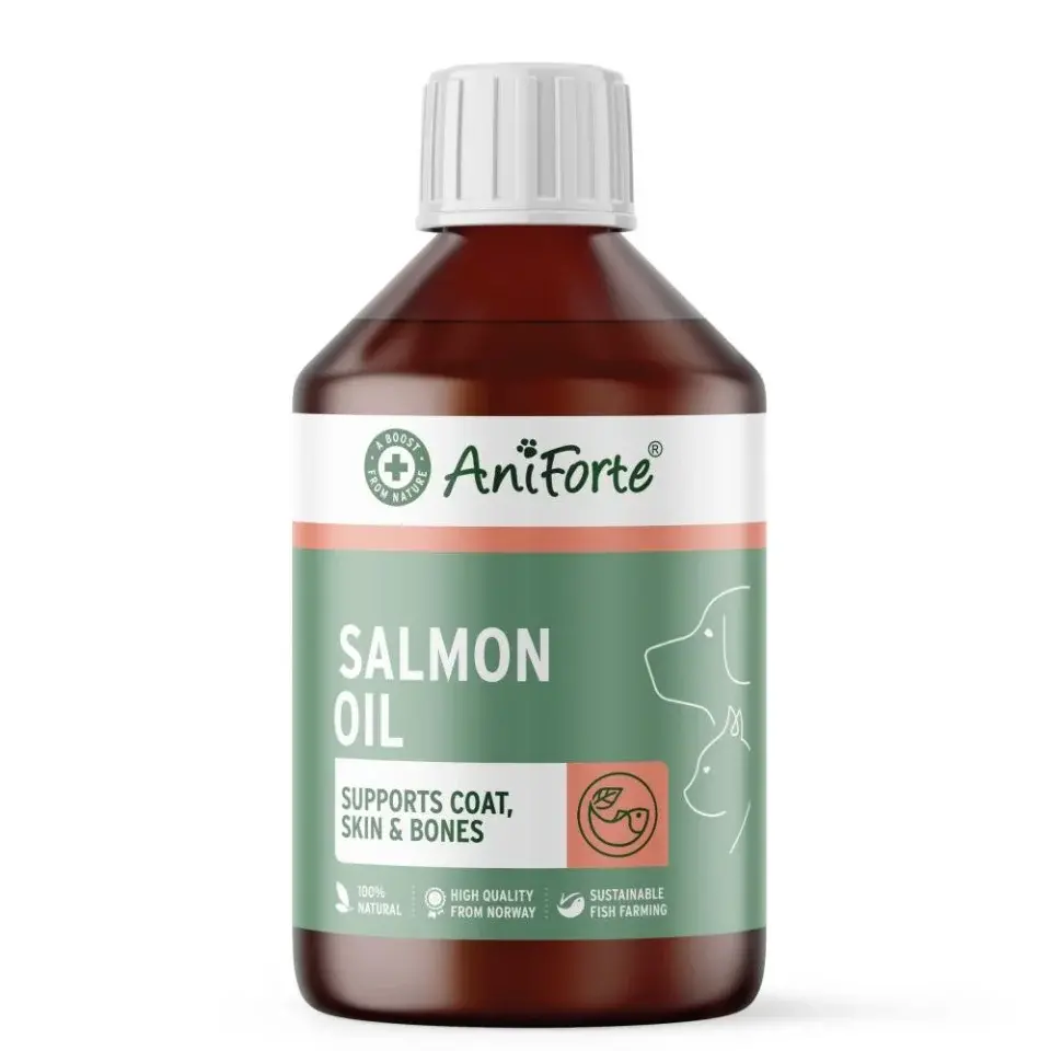 Huile de saumon pour chien complément alimentaire oméga-3 animaux AniForte France Antos boutique animaux santé pelage chien